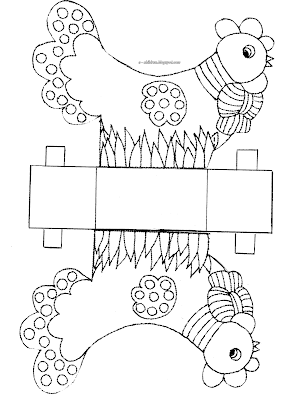 Εκτυπώνουμε σε χαρτόνι άσπρο (ή σε απλό χαρτί πολυγράφου και μετά το κολλάμε σε χαρτόνι). Τα παιδιά ζωγραφίζουν με χρώματα της αρεσκείας τους. Κόβουν και στη συνέχεια κολλάμε ή συρράβουμε τις ενώσεις. Γεμίζουμε με "άχυρα" ή λωρίδες από γκοφρέ χαρτί (γιατί είπαμε δεν διαθέτουν τα σχολεία μας τα πάντα) και τοποθετούμε το αβγό που έχουμε βάψει με τα παιδιά.
